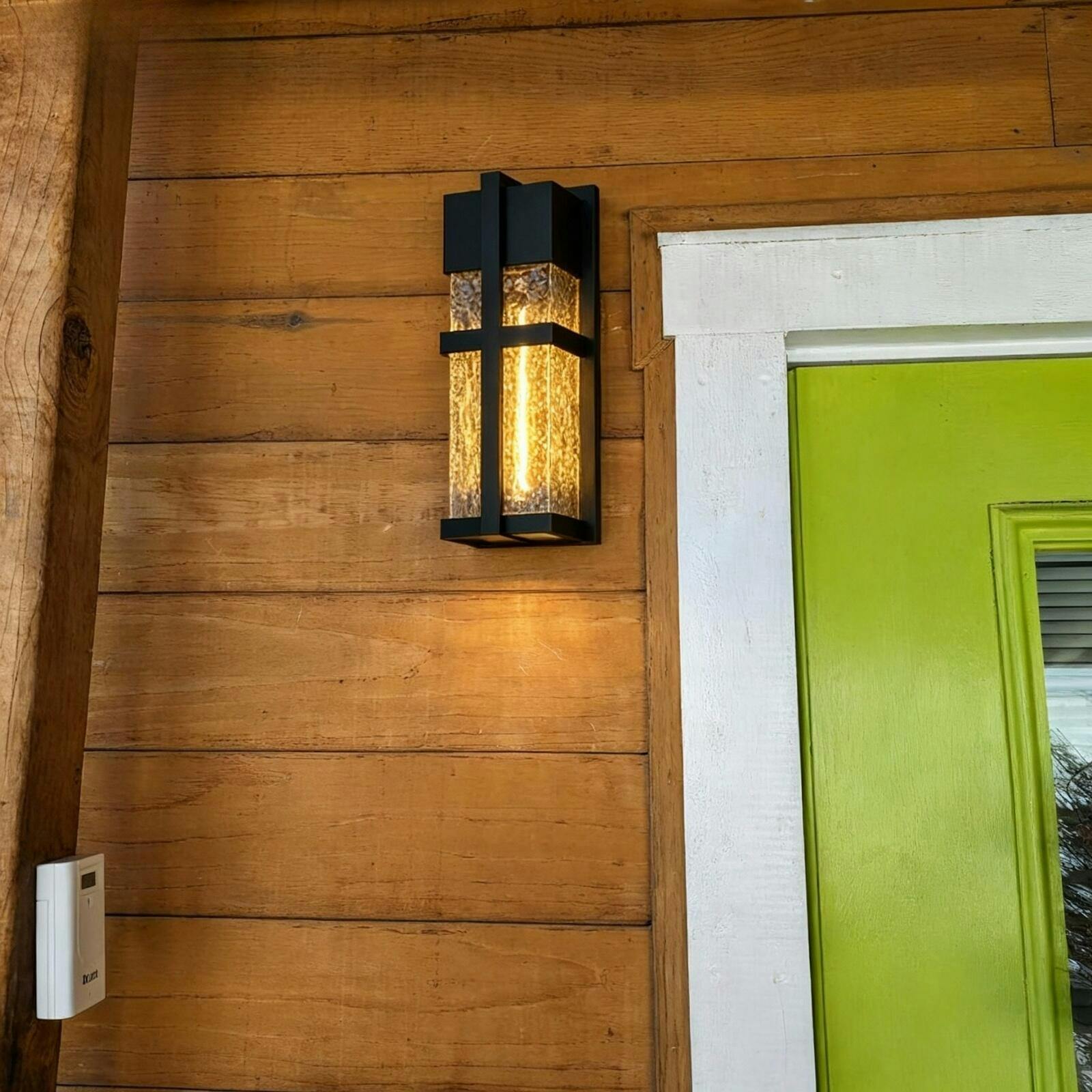 [Modern Style with Seeded Glass]: This black exterior wall sconce pairs minimalist design with timeless beauty. The frameless one-piece seeded glass resembles a crystal-clear ice cube, casting a soft and even glow that enhances your front porch, patio, or outdoor entryway. Compatible with standard E26 LED bulbs, it brings modern elegance to your home’s exterior.
