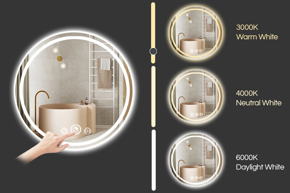 Round LED Bathroom Mirror, 3000K-6000K Dimmable and Many Sizes