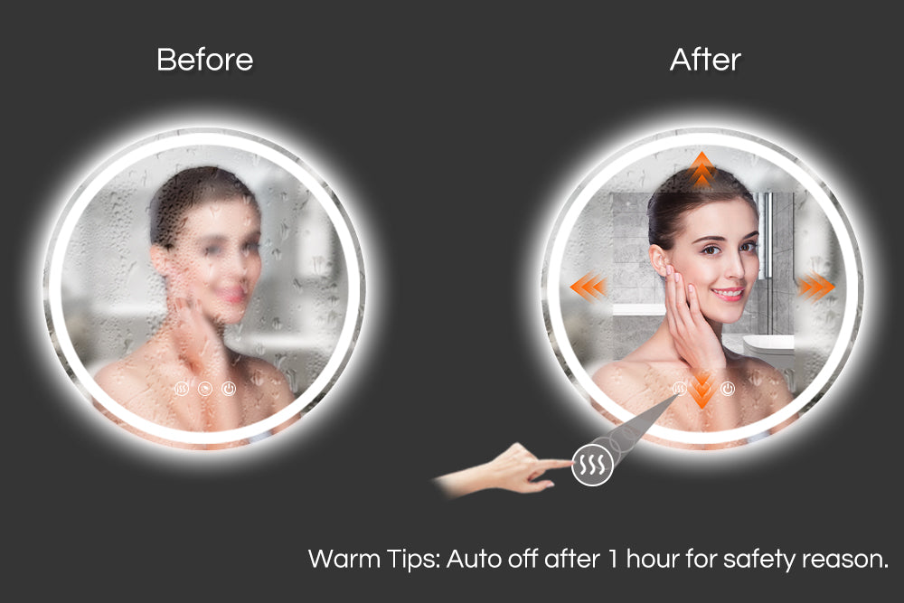 There is a defogging button on the mirror, turn on can prevent the mirror from fogging up and ensure the mirror remains clear,distortion-free refection.
