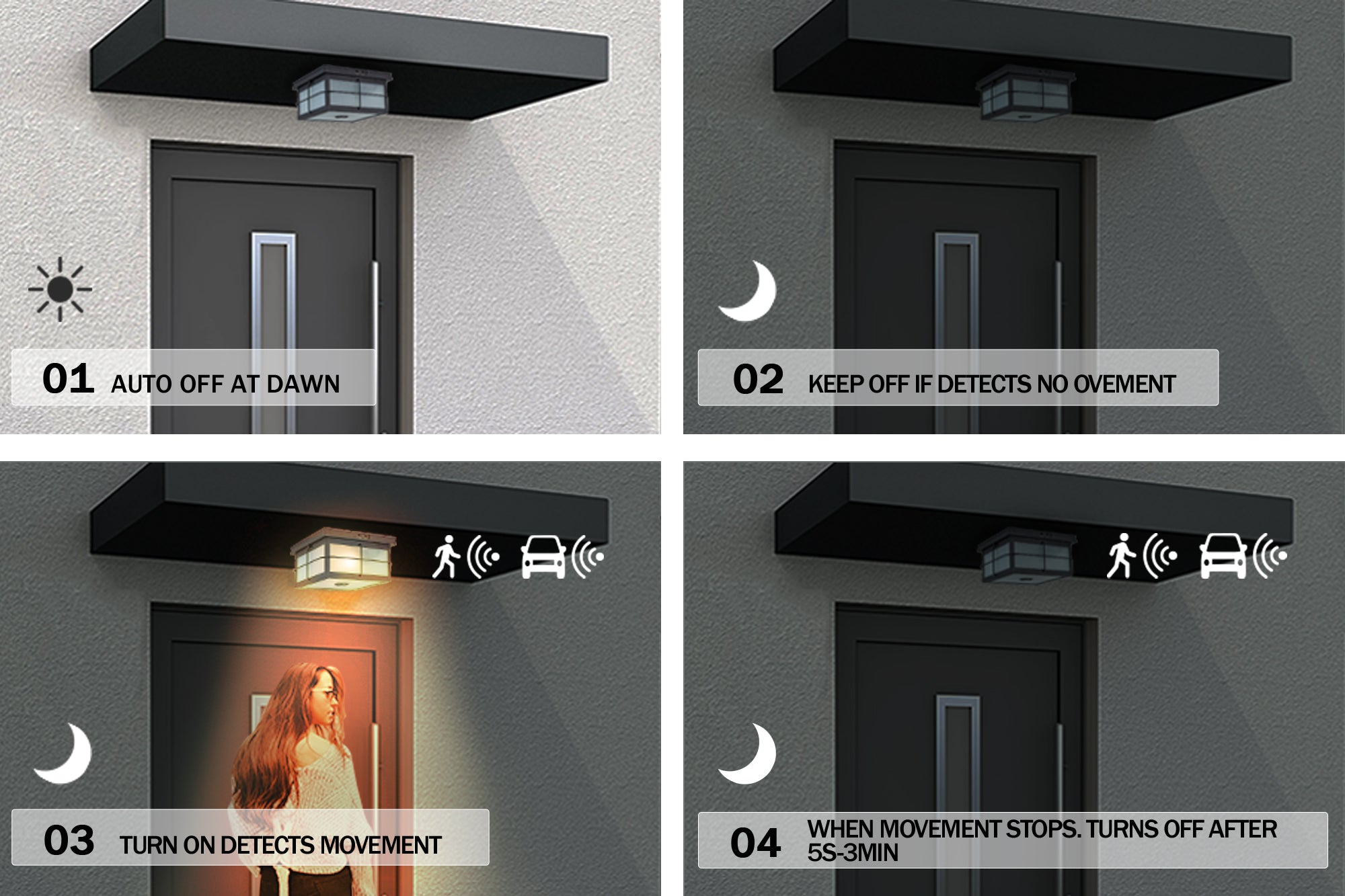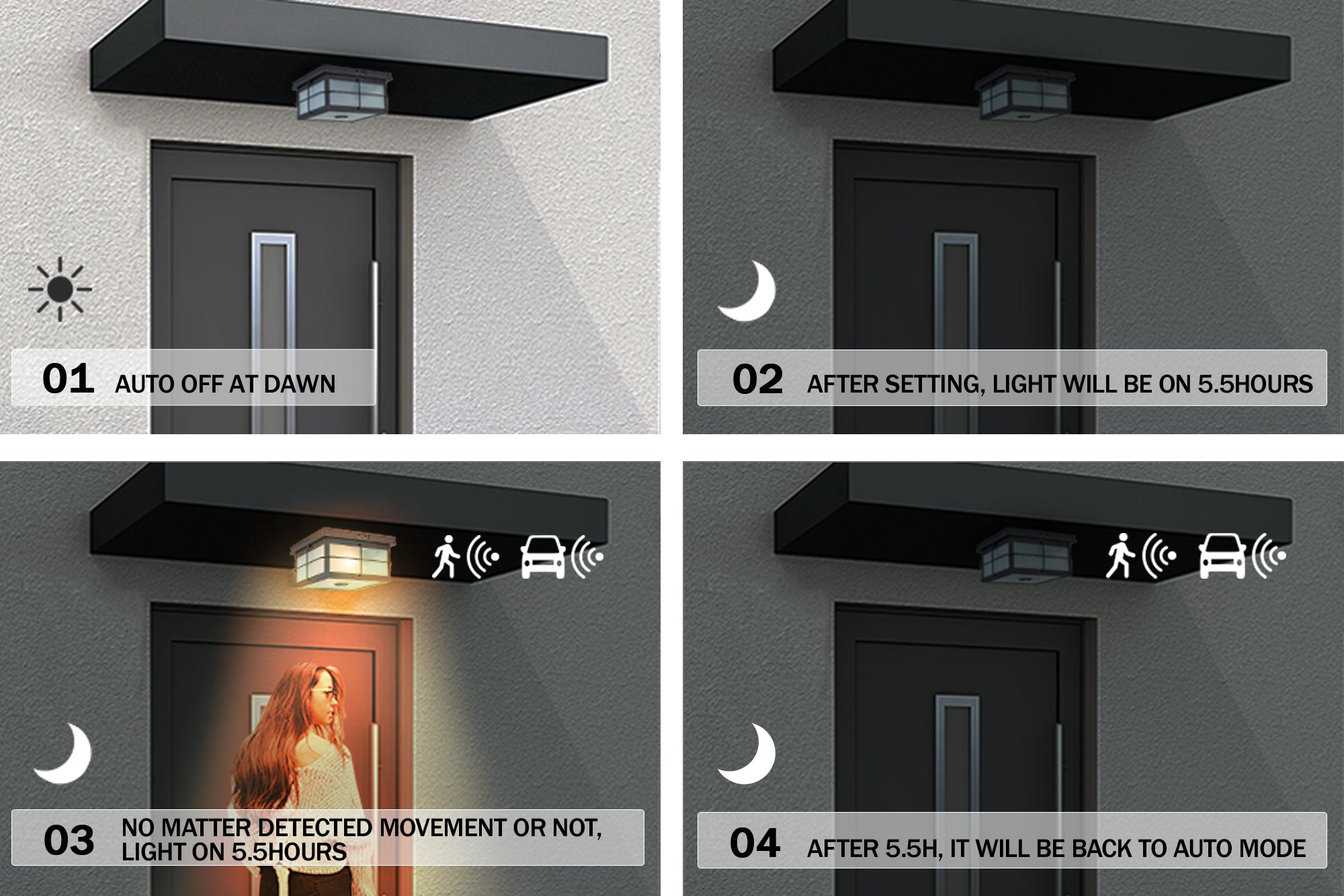 Auto turn on once motion is detected, when no motion is detected,it’ll stay on for the preset time lag, then turn off
