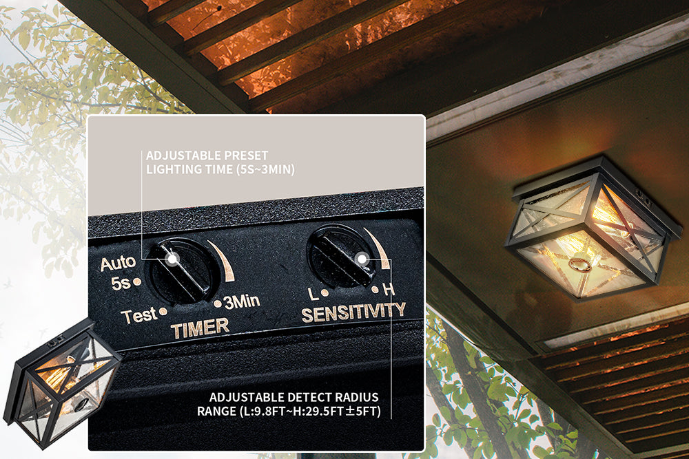 The sensor range and time lag of this outdoor ceiling light are adjustable. It has a 360-degree angle, range from L(9 ft) to H(26 ft), and a time lag from 5 sec to 3 min. For max range, install at 9 feet.