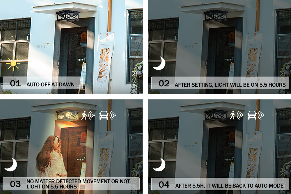 Auto turn on once motion is detected, when no motion is detected,it’ll stay on for the preset time lag, then turn off